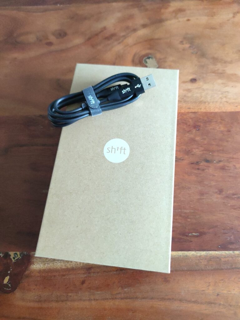 Wie schon erwähnt, dauerte es eine ganze Weile bis ich mein neues Shiftphone in den Händen halten konnte. Umso größer war die Freude als der Tag endlich kam. Schon als ich es aus der Verpackung nahm, welche aus recyceltem, ungebleichtem Papier hergestellt wurde, konnte ich eine wertige und angenehme Haptik feststellen. Es fühlte sich einfach gut an! Geliefert wurde das Gerät mit dem Haueigenen ShiftOS G welches mit vorinstallierten Google Diensten den meisten ein schnelles und einfaches Einrichten ermöglicht. Als Zubehör lag ein Lade- und Datenkabel, USB-C auf USB-C dabei und ein Adapter auf USB-A für den Anschluss an einem PC. Auf die Beigabe eines Ladesteckers verzichtet der Hersteller bewusst, da davon eigentlich jeder mehr als genug rumliegen hat.